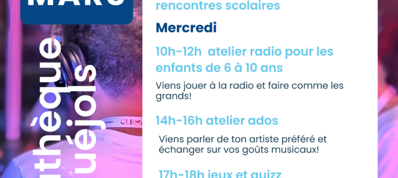 Pendant les vacances, la médiathèque vous accueille autour du magnifique tapis réalisé à partir de l’album « l’arbre m’a dit » : il a été créé à l’initiative de la médiathèque départementale et le dispositif « premières pages » (livres offert à tous les bébés cantaliens par le Département). Ce moment d’histoires et comptines…