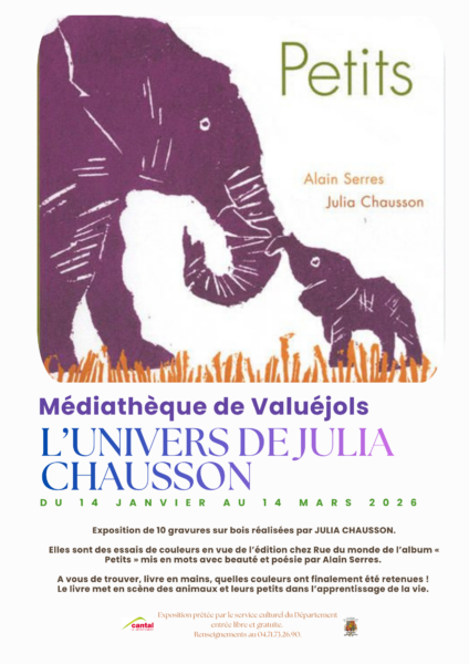 Avec cette nouvelle exposition, les enfants s’immergent dans l’univers pictural de Julia Chausson. Les 10 gravures qui la composent sont des essais de couleurs en vue de l’édition chez Rue du monde de l’album « Petits » mis en mots avec beauté et poésie par Alain Serres. A vous de trouver, livre en mains, quelles couleurs ont finalement été retenues ! Le livre met en scène des animaux et leurs petits dans l’apprentissage de la vie. Une succession de duos, parent-enfant, montre le franchissement d’obstacles sous la protection d’un parent, chacun ayant sa manière. Y figurent l’éléphant, le cygne, la girafe, les tortues, l’ours polaire et bien d’autres. Julia Chausson utilise la technique de la gravure sur bois pour les mettre en scène. L’utilisation d’une seule couleur pour la mère et l’enfant dissimule parfois le petit qu’on s’amuse alors à chercher. Une sélection d’ouvrages à lire et à découvrir, illustrés par l’artiste complètent cette exposition, prêtée par le service culturel du Département.