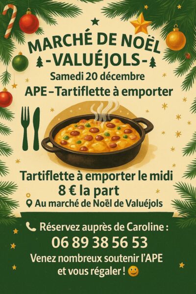 Le marché de Noël approche, voici encore une belle occasion de se retrouver pour un bon moment convivial avec pleins d’animations pour tous. Réservez dès maintenant votre part de Tartiflette! A très bientôt!