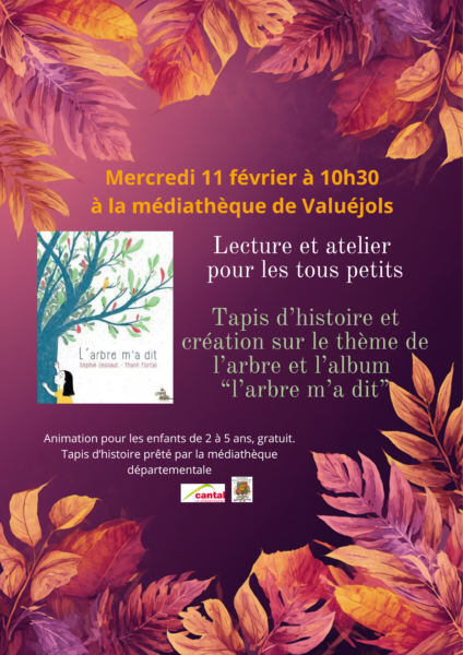 Pendant les vacances, la médiathèque vous accueille autour du magnifique tapis réalisé à partir de l’album « l’arbre m’a dit » : il a été créé à l’initiative de la médiathèque départementale et le dispositif « premières pages » (livres offert à tous les bébés cantaliens par le Département). Ce moment d’histoires et comptines sera suivi d’un atelier sur le thème de l’arbre. Animation gratuite pour les tous petits.